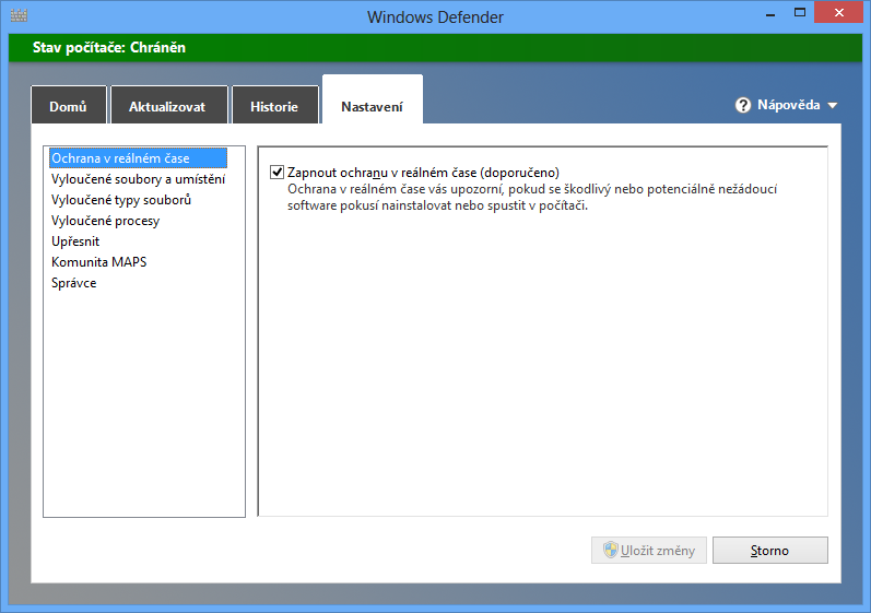 Ve Windows 8 nalezneme Windows Defender také, ale s výše popsaným programem nemá vůbec nic společného. Jde o přejmenovaný antivirový program Microsoft Security Essentials, který poskytuje ochranu před všemi typy záškodnických programů včetně spywaru. Nabízí všechny funkce, které by antivirovému programu neměly chybět včetně ochrany v reálném čase.