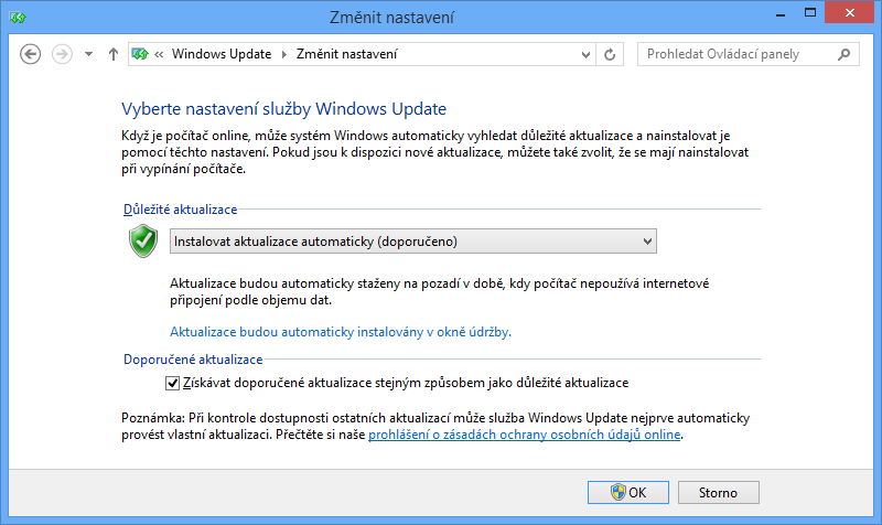 Systém sám ve výchozím nastavení, které lze změnit, stahuje a instaluje důležité aktualizace. Pro instalaci volitelných aktualizací stačí otevřít okno v Ovládacích panelech. Windows Update ve Windows 8 však přináší dvě novinky. První z nich je, že aktualizuje i integrovaný antivirový program. Druhou pak, že aktualizuje doplněk (tzv. plug-in) jménem Flash Player pro webový prohlížeč.