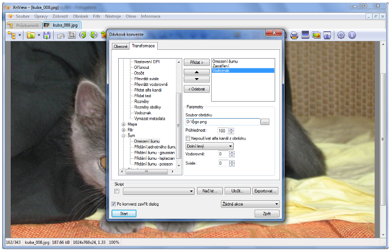 Zobrazený obrázek umí XnView převést do některého z 50 podporovaných formátů. Nabízí i dávkovou konverzi, tedy hromadný převod více souborů z jednoho formátu do druhého. Dávkově je možné provádět také nespočet úprav včetně vkládání vodoznaku, změny velikosti obrázků a jejich otáčení, potlačení šumu a tak dále. Možností jsou desítky.