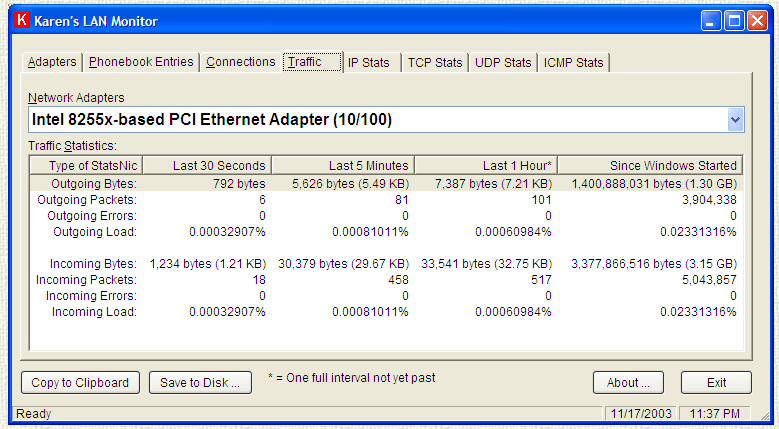 LAN Monitor tiež zobrazuje v reálnom čase štatistiky prevádzky, vrátane prijatých a odoslaných bytov, chyby prenosu a sieťové pripojenie, faktory zaťaženia.