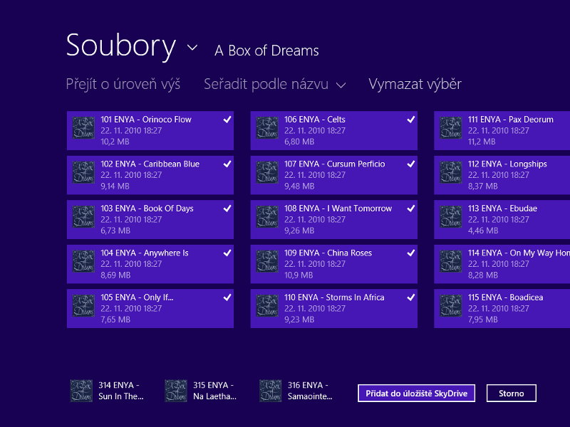 Slabiny se též najdou nahrávání nových souborů z počítače do úložiště. Zatímco webové rozhraní podporuje jednoduché přetažení souborů z plochy nebo průzkumníka, tak v aplikaci SkyDrive pro Modern UI k nahrávání slouží výhradně poněkud těžkopádný správce souborů, který navíc neumožňuje nahrát celé složky. Je nutné si složku v úložišti nejdříve založit a pak do ní nahrát jednotlivé soubory ze zdrojové složky na pevném disku. Alespoň, že je podporován hromadný upload.