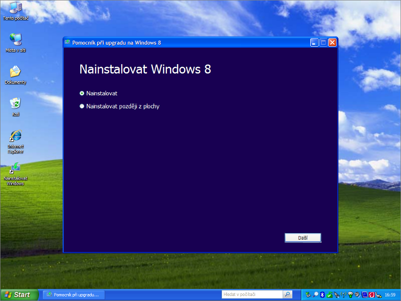 Teprve po dokončení stahování je možné přikročit k samotné instalaci. Tu můžete spustit okamžitě z programu Pomocník při upgradu na Windows 8 anebo kdykoliv později přes zástupce „Nainstalovat Windows“, který se vytvořil po úspěšném stažení instalačních souborů na ploše systému. V závislosti na výkonu počítače může být instalace i dosti zdlouhavá oproti běžné čisté instalaci systému z DVD.