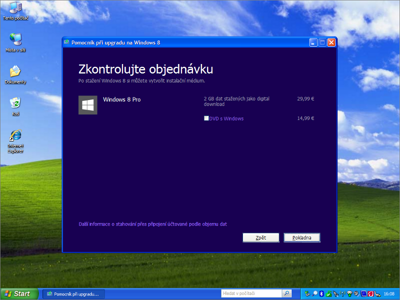 Ideální ale je vše důležité si zálohovat a nezachovávat při upgradu v počítači vůbec nic. Je to příležitost udělat si pořádek v datech. V dalším kroku klikněte na tlačítko „Objednávka“ V následujícím kroku si k upgrade licenci Windows 8 Pro za 29,99 € můžete objednat zaslání instalačních DVD za příplatek 14,99 €. Pokud ale nechce přecházet mezi 32bitovou a 64bitovou variantou systému nebo naopak, tak je to zbytečné.