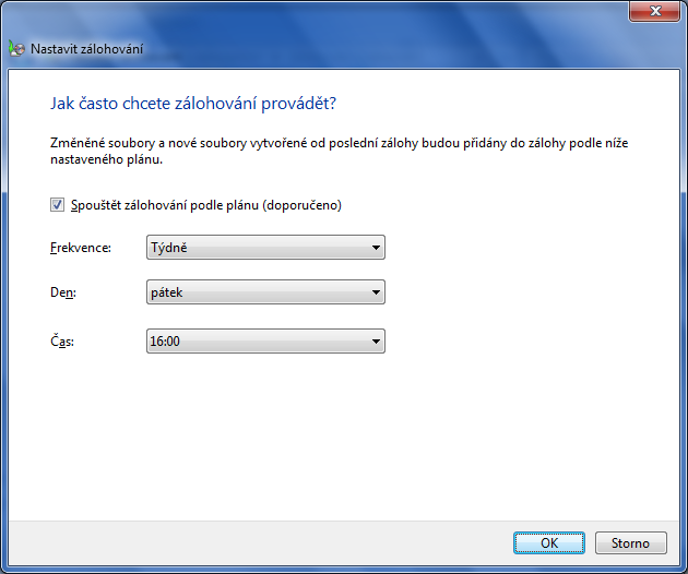 Zálohování lze spouštět manuálně anebo je možné jej naplánovat. Žádné bohaté možnosti plánování ale nečekejte. Samotné zálohování ve Windows 7 nabídne pouze možnost zálohovat ve zvolený čas každý den nebo konkrétní den a čas v každém týdnu či v celém měsíci.