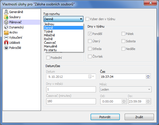 Zálohování celého disku nebo zálohování vybraných souborů a složek lze samozřejmě naplánovat. Zálohovat lze ve zvolený čas jednou denně nebo vždy po uplynutí nějaké doby (např. každé dvě hodiny), jednou týdně nebo ve vybrané dny v týdnu, ve vybraný den nebo dny v měsíci anebo při událostech jako je zapnutí počítače, vypnutí nebo resetování počítače či odhlášení a přihlášení uživatele.