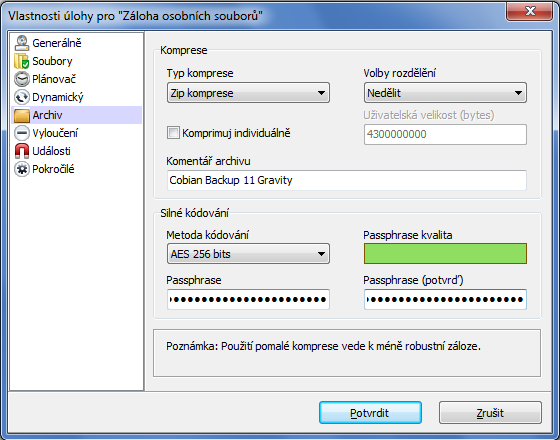 Cobian Backup ovšem podporuje i kompresi zálohovaných souborů díky jejich zabalení do archivů formátu ZIP nebo 7Z. Bohužel není možné nastavit míru komprese. Zato je tu funkce pro automatické dělení zálohy do archivů přednastavené velikosti. To se hodí zejména, pokud si zálohu budete chtít prostřednictvím jiného programu vypálit například na CD/DVD. Nastavíte si tedy, že se záloha má dělit na soubory, které se vejdou na požadovaný typ média.