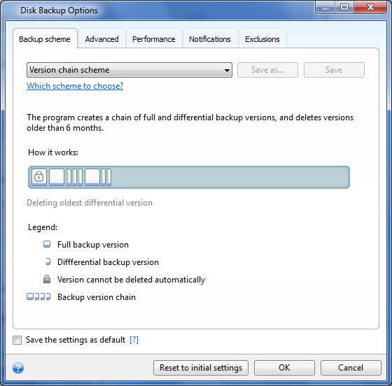 Samozřejmě lze namísto automatického řetězení záloh nastavit vlastní pravidla, jakým způsobem se mají zálohy vytvářet: kdy provést opakovanou kompletní zálohu, jak dlouho ponechávat uložené starší zálohy atd. Podobná nastavení lze též provést i při využití funkce pro pouhé zálohování vybraných souborů a složek, tedy nikoliv kompletního disku resp. jeho obrazu.