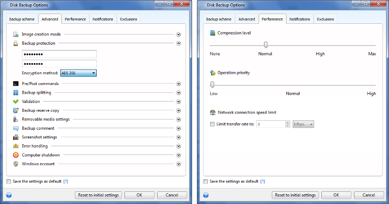 Soubory zálohy je opět možné dělit na menší části vhodné třeba k snadnému vypálení na CD/DVD nebo Blu-ray médium. Záložní kopie je též možné zmenšit díky nastavitelné kompresi. Použít lze tři stupně komprese nebo kompresi úplně vypnout. Čím větší úroveň komprese je použita, tím déle bude záloha trvat. Také je podporována ochrana dat za využití 128bitového, 192bitového nebo 256bitového AES šifrování.