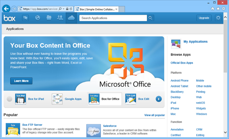 Může to znít podivně, ale nejsilnější stránkou úložiště Box.com je právě to, že skutečně funguje jako úložiště. Přesněji řečeno: v případě této služby je nadstandardně rozvinuta spolupráce s produkty třetích stran, které dovedou Box.com využít pro ukládání a sdílení dat. Ať už jde o mobilní aplikace, desktopový software či online služby. Zatímco ve webovém prostředí Box.com spolupracuje s Google Docs, v desktopovém prostředí díky plug-inu Box Office poslouží uživatelům Microsoft Office.