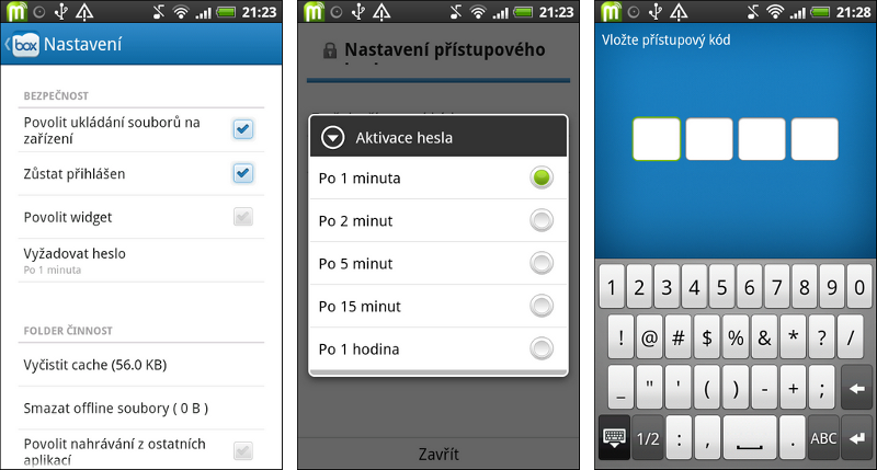 Za pochvalu ještě stojí možnost používat pro přístup k aplikaci PIN, kterým lze zároveň ochránit data v internetovém úložišti bez nutnosti neustálého odhlašování a opakovaného složitého zadávání přístupových údajů. Čtyřmístný PIN je rozumným kompromisem. Požadavek k jeho zadání není vázán na zhasnutí displeje, ale přednastavenou dobu nečinnosti v rozmezí od jedné minuty do jedné hodiny. Volitelně lze též využívat plnohodnotné automatické odhlášení.