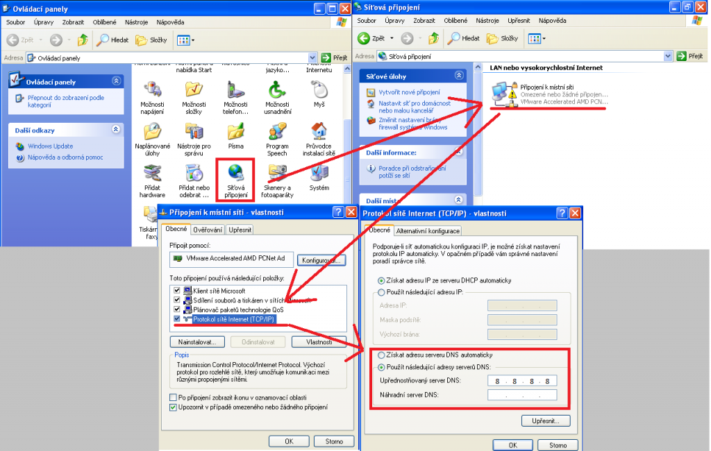 Nejdříve přes nabídku Start otevřeme Ovládací panely -> v nich otevřeme Síťová připojení -> vybereme adaptér a přes pravé tlačítko myši zvolíme Vlastnosti -> poklikáme na Protokol sítě Internet (TCP/IP) -> Do polí pro DNS servery napíšeme IP našeho DNS serveru (třeba 8.8.8.8 od Googlu). Vše potvrdíme a po tomto by měl již prohlížeč fungovat. Pokud ne, není chyba v DNS.
