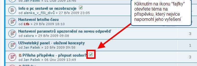- každé takto označené téma je možné otevřít přesně na příspěvku, který jste označili coby rozhodující pro vyřešení dotazu. Otevřete ho kliknutím na ikonu „fajfky“ v přehledu témat.