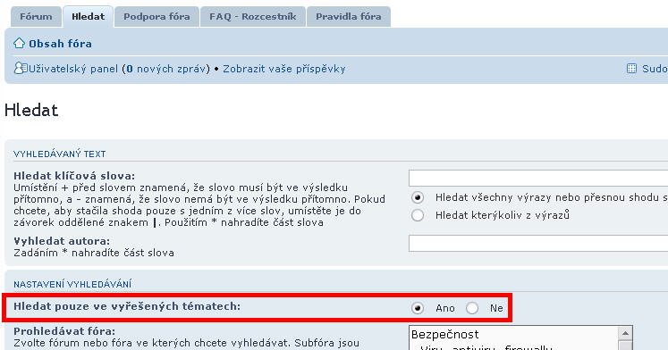 - funkce Hledat umožňuje mimo jiné hledat pouze ve vyřešených tématech