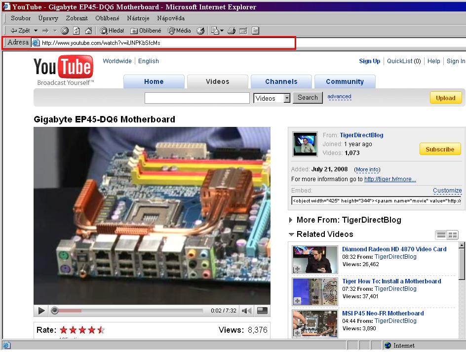V prohlížeči otevřte stránku s videem, které chcete vložit do diskusního fóra. Klikněte na řádek adresa Vašeho prohlížeče. Celý řádek by se Vám měl označit. Stiskněte CTRL+C (klávesová zkratka pro zkopírování do schránky Vašeho PC)