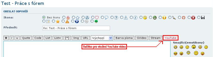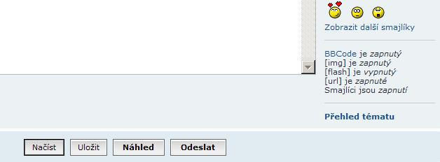 Průběžně tak jak píšu text odpovědi mohu kliknutím na jednotlivé smajlíky (pokud mám smajlíky povolené) tyto smajlíky vložit :o Pak :D mám :smile: například :shock: takto :? prosmajlíkovaný :lol: text :P