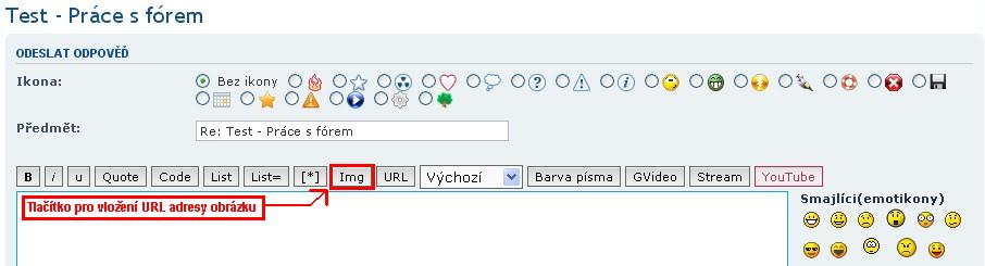 Tlačítka pro vložení obrázku (Img) a odkazu (URL) z jiných serverů