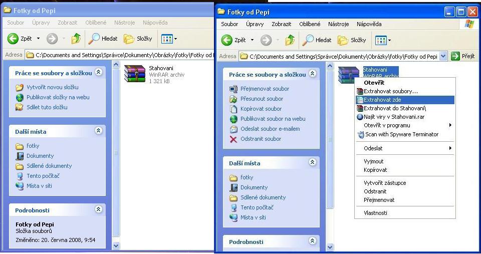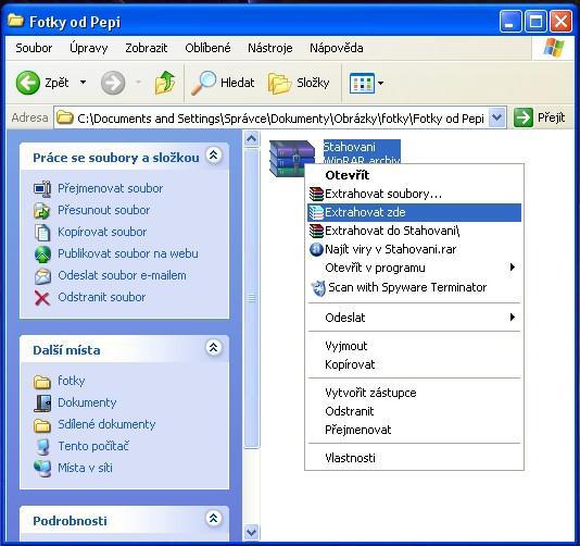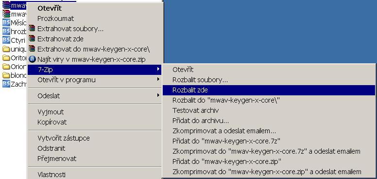 Na stažený soubor klikneme pravým tlačítkem myši a v otevřené rozvírací nabídce vybereme volbu „Extrahovat zde“.