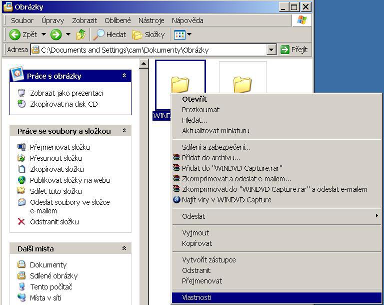Otevřeme na složku (adresář) u které chceme změnit nastavení zobrazení. Na vybranou složku klikněte pravým tlačítkem myši a z nabídky vyberte „Vlastnosti“.