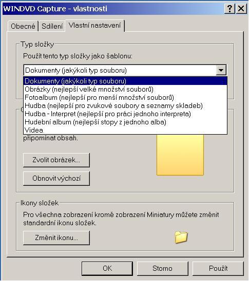 V otevřeném okně vyberte záložku „Vlastní nastavení“. V části „Typ složky“ klikněte levým tlačítkem myši na šipku výběru a po té klikněte v nabídce na „Fotoalbum“ („Filmový pás“).