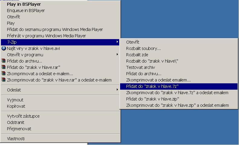 Na obrázku vidíme, jak se program 7zip integroval do systému, toto je menu výběru po kliknutí pravým tlačítkem myši na soubor s názvem „zralok v hlave“.