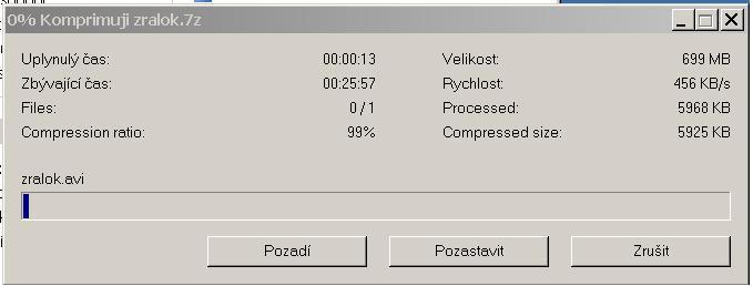 Další obrázek nám ukazuje průběh komprimace souboru „zralok“ s tím, že jako u předchozího programu (WinRar) je možné komprimaci pozastavit nebo spustit na pozadí.