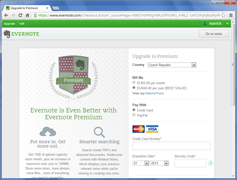 Řeč je třeba o vyžadování poskytnutí údajů o platební kartě pro zaplacení za prémiové služby. Evernote se tedy v tomto ohledu řadí těm lepším, kteří akceptují platby i z nezávislých platebních systémů, ale platby kartou akceptuje rovněž. Čím více službám lidé sdělí informace nutné pro uskutečnění online platby kartou, tím více roste riziko jejich prozrazení a následného zneužití karty.