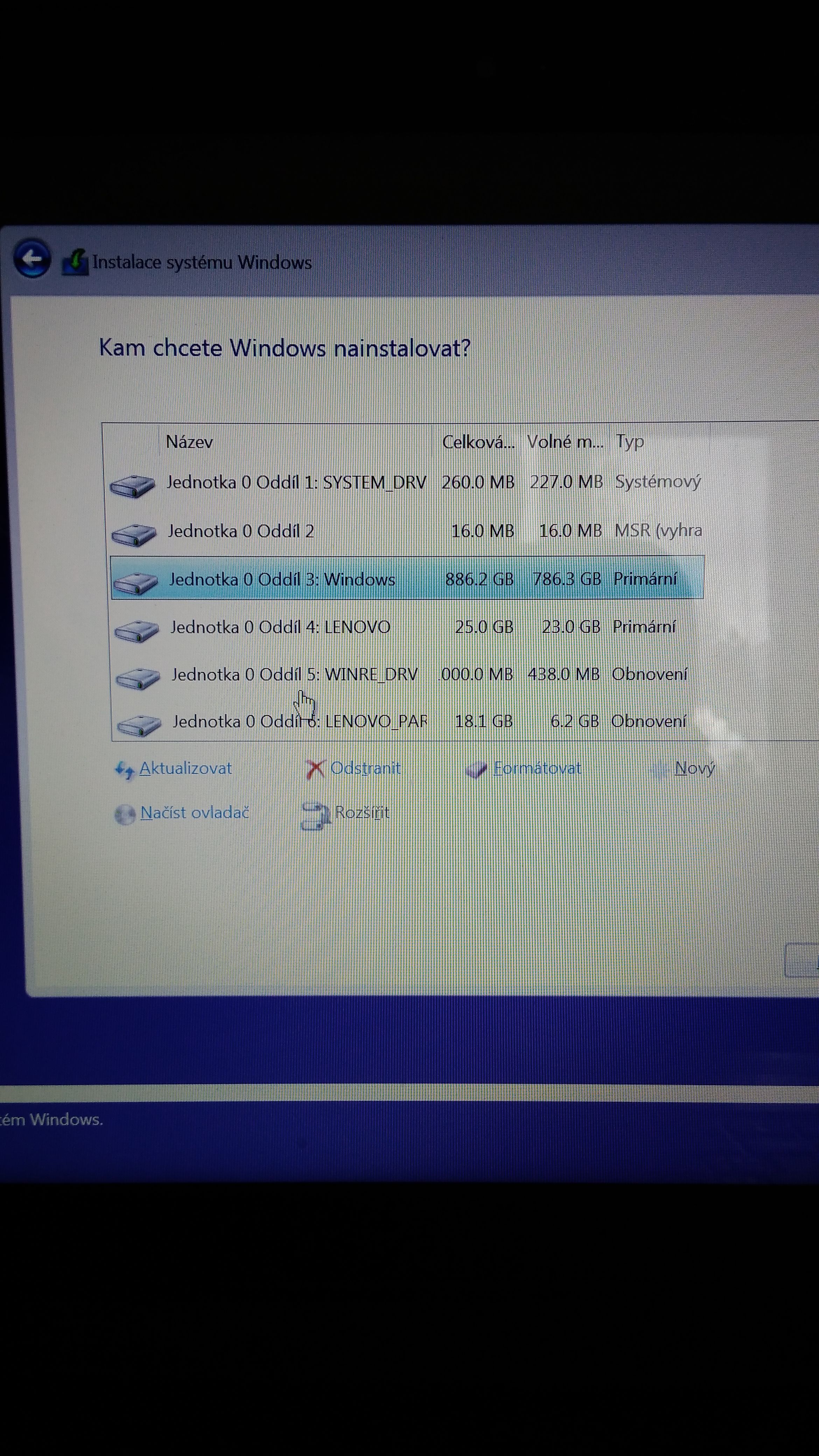 Posunul jsem se k reinstalaci windows, avšak nevím jak mám postupovat. Zeptali se mne to na typ instalace, dal jsem "jenom nainstalovat Windows". Pak se mi zde objeví několik oddílů, nevím co s nima, jestli všechny formátovat. Co musím udělat aby vznikla ta čistá instalace?