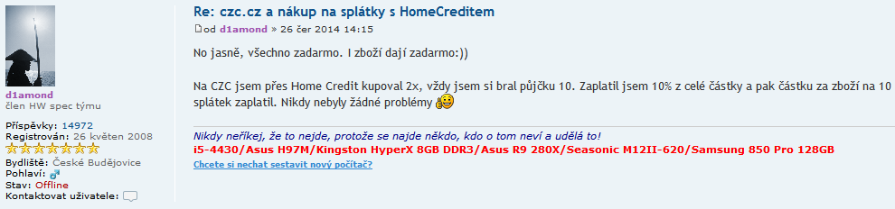 Nemáte někdo zkušenosti s touhle formou na desetiny u czc od HC ? Pokud ve finále přeplatim 10% ceny tak dobrý, pokud ale bych měl přeplatit 25% a víc, neni moc výhodné si brát pc za 24k od nich. 4etl jsem tu rok staré články, kde i místní členové pc-helpu psali, že splátky na desetiny byly vždy v pořádku.