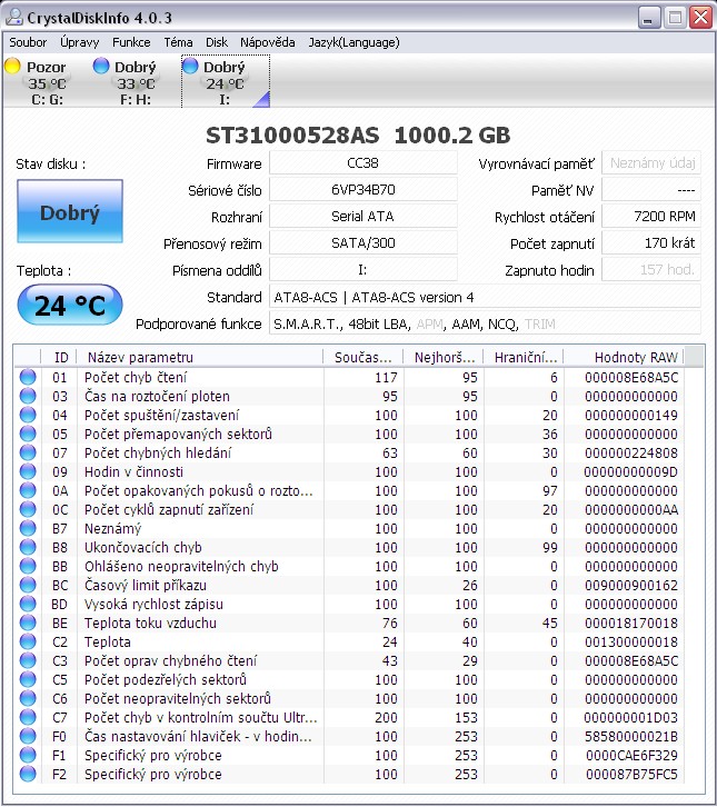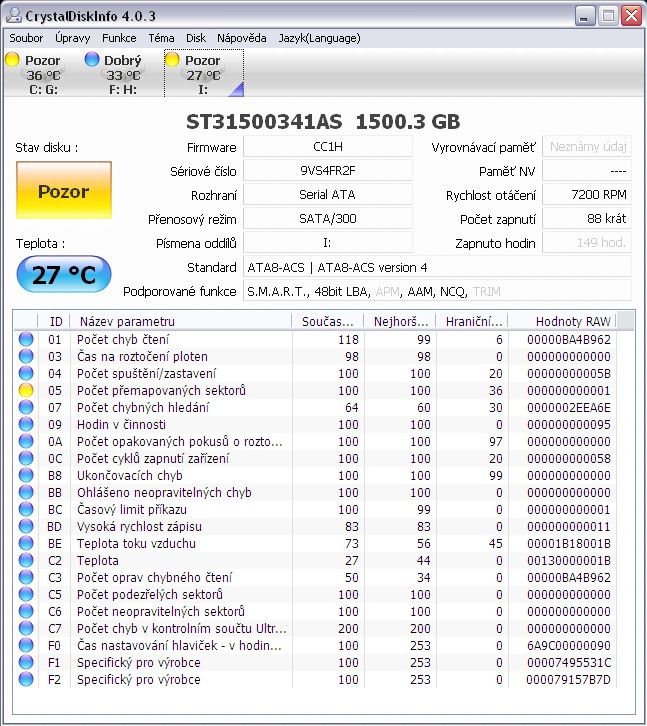 Tak jsem je ještě projel tím Crystal Disk Info a, světe div se. Disk 1000 GB to hlásí jako dobrý, jen toho 1500 GB velký počet přemapovaných sektorů: