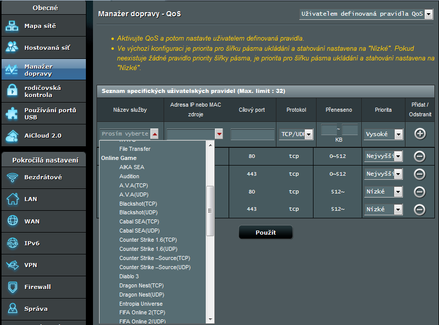Manažer dopravy (QoS) doznal zjednodušení a přibylo uživatelské nastavení výhodné zvláště pro hráče internetových her. Stačí vybrat oblíbenou hru, nastavit IP a nejvyšší prioritu a máte zaručeno, že pakety pro vaši hru budou doručovány přednostně.