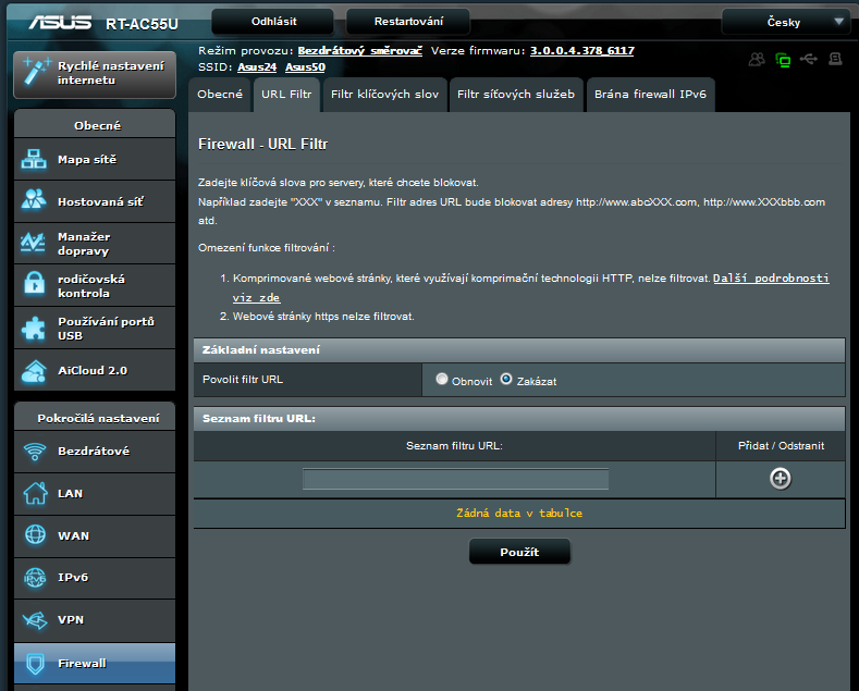 - Firewall - pokud vám v rodičovské kontrole chybělo omezení nevhodných stránek, postačí zadat jejich URL do filtru firewallu. Do záložky Filtr klíčových slov můžete zadat filtrování podle klíčových slov stránek.