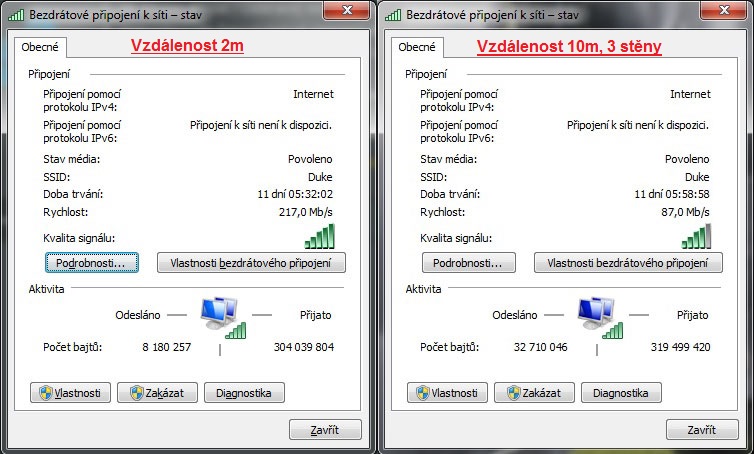 A protože se zde často objevují dotazy k pokrytí venkovních prostor, rozhodl jsem se, že zkusím i to. Výkon routeru a tři antény si o to přímo řekly. Router jsem umístil na balkon a vyrazil s mobilem (Nokia Lumia 710) až k plotu. Ten je od balkónu vzdálen zhruba 100m. Internet na mobilu fungoval bez problémů. Vezmeme-li v úvahu, že síla signálu slábne se čtvercem vzdálenosti, pak si můžeme dovolit klidně i 200m.