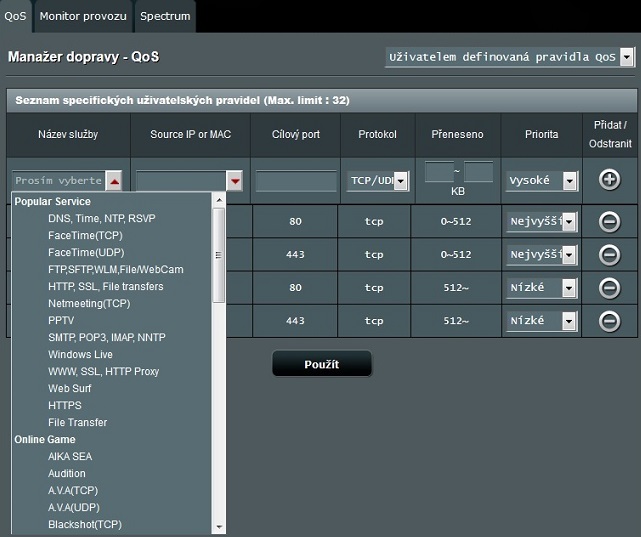 Potřebujete omezit data pro jednoho či více uživatelů v síti? Žádný problém. Nejenže router nabízí spoustu výchozích nastavení, ale samozřejmě si můžete přidat vlastní. A velké plus za možnost nastavit omezení na určitý port. Tak můžete omezit např. stahování souborů, zatímco komunikace přes skype, či procházení internetu zůstane bez omezení.