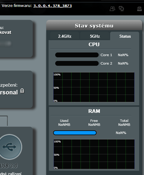 Router jsem koupil s FW 3.0.0.4.376.3626 (2014/11/14), přitom jsou 2 novější verze. Nejnovější je 3.0.0.4.378.3873 (2015/01/12), ale router hlásil, že je FW aktuální. Manuální aktualizace proběhla OK, ale nefungoval monitoring využití CPU a RAM