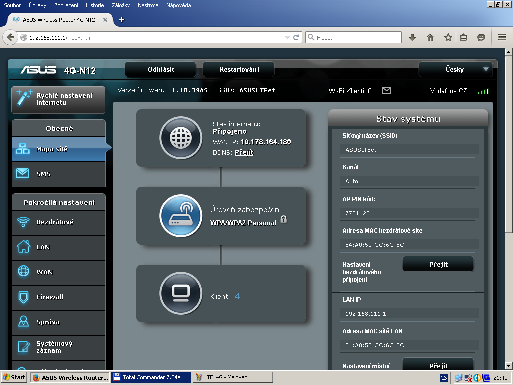 A nyní k LTE. Respektive k mobilnímu signálu, protože router umí nejen LTE, ale podporuje i starší (3G a 2G) technologie. Vloženou SIM kartu router sám detekuje, dokonce správně identifikuje, jaké služby SIM umí – použil jsem kartu ze svého mobilu a byly rozeznány i hlasové služby. Pokud měníte nastavení WAN sítě z pevné do LTE a máte kartu blokovánu PINem, doporučuji restart routeru. Při nastavování LTE mi nešel zadat PIN pro SIM kartu, po restartu routeru již bylo vše v pořádku.