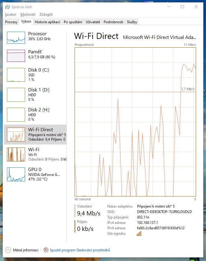 Zkoušel jsem to taky bezdrátově ale je to taky nestabilní. Asi mně nestíhá wifi v PC nebo nevím. Nepřipojí se to k pc pokaždé - někdy až napotřetí a pak při puštění filmu a přetáhnutí do TV ve správci úloh na PC jsem měl Wifi direct vysoce přes čáru, která je 7,7 Mb/s. Skákalo to až k 16 Mb/s, což způsobovalo brutální trhání.wifi v PC mám přes USB Tenda W322U Wireless-N USB Adapter