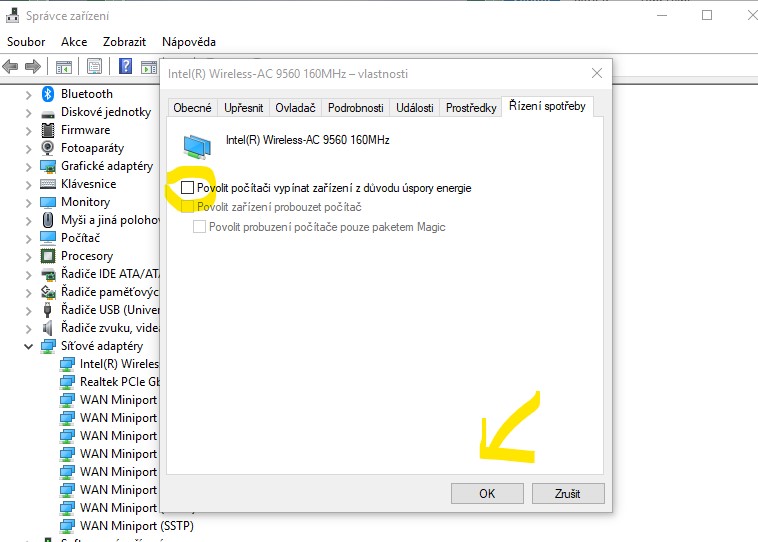 Pokud chceš zakázat počítači, aby ti nevypínal wifi z důvodu spoření energie, tak to nesmíš mít zaškrtlé. Tedy to musíš na první řádce odškrtnout a uložit.