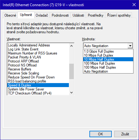 Nejprve začni 10Mbps HalfDuplex, pak 10Mbps FullDuplex, totéž na 100Mbps.