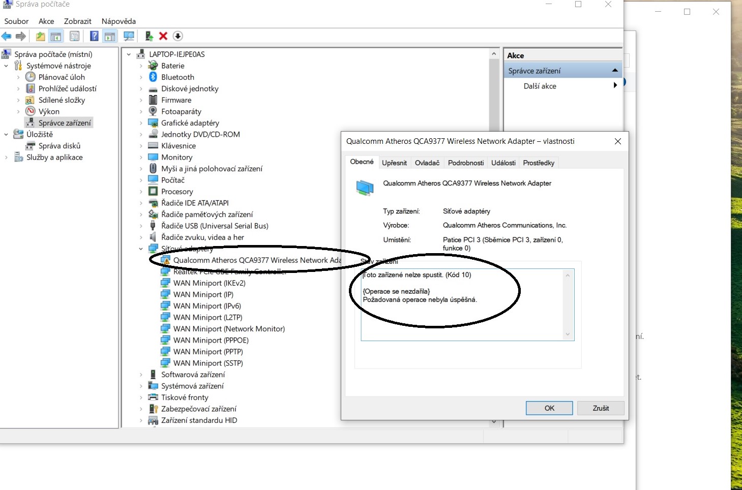 prosím o radu s připojením k wifi. Od včera mi nejde připojit k wifi, ani mi to žádnou wifi v "Síť a internet" nenabízí (viz obr). A mezi síťovými adaptéry mám u "Qualcomm Atheros..." vykřičník, a když na něj kliknu, píše to, že zařízení nejde spustit (viz druhý obr.). Prosím o radu, jak se zase dostat na wifi. Jsem bezradná... :-(