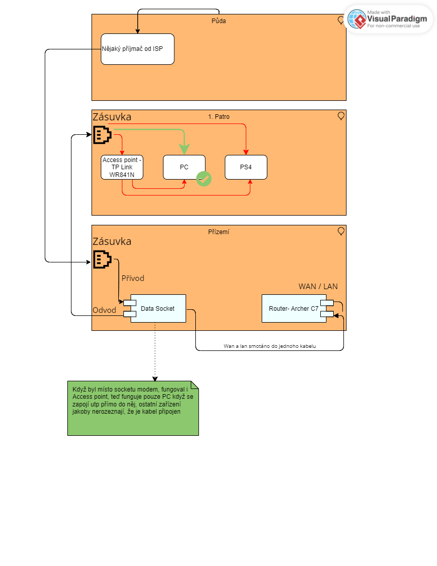 Pro lepší představu posílám jako přílohu obrázek jak asi vypadá zapojení: Původně byl místo data socketu modem, to vše fungovalo, nedávno tu ovšem byli experti měřit sílu připojení a přitom si řekli, že by bylo dobré modem zrušit a dát místo toho data socket a smotat mě kábly do jakésiho rozdvojujícího se soketu. Jak odjížděli tak jim Access point záhadně fungoval, takže nebyl problém wifi byla extendována a lan připojení taky fungovalo. Nicméně po chvíli to celé v 1. patře přestalo jet a jediné zařízení, které rozezná ten kabel a opravdu internet funguje je PC. Zkoušel jsem měnit kabely, různě připojovat starý modem, pohrát si s tím routrem, z kterého byl udělán access point, také třeba zkusit nastavit na PS4 ručně IP adresu a všechny náležitosti jako subnet mask default gateway DNS servery atd.. ale nic. Z nějakého důvodu to funguje jen když se zapojí do PC.