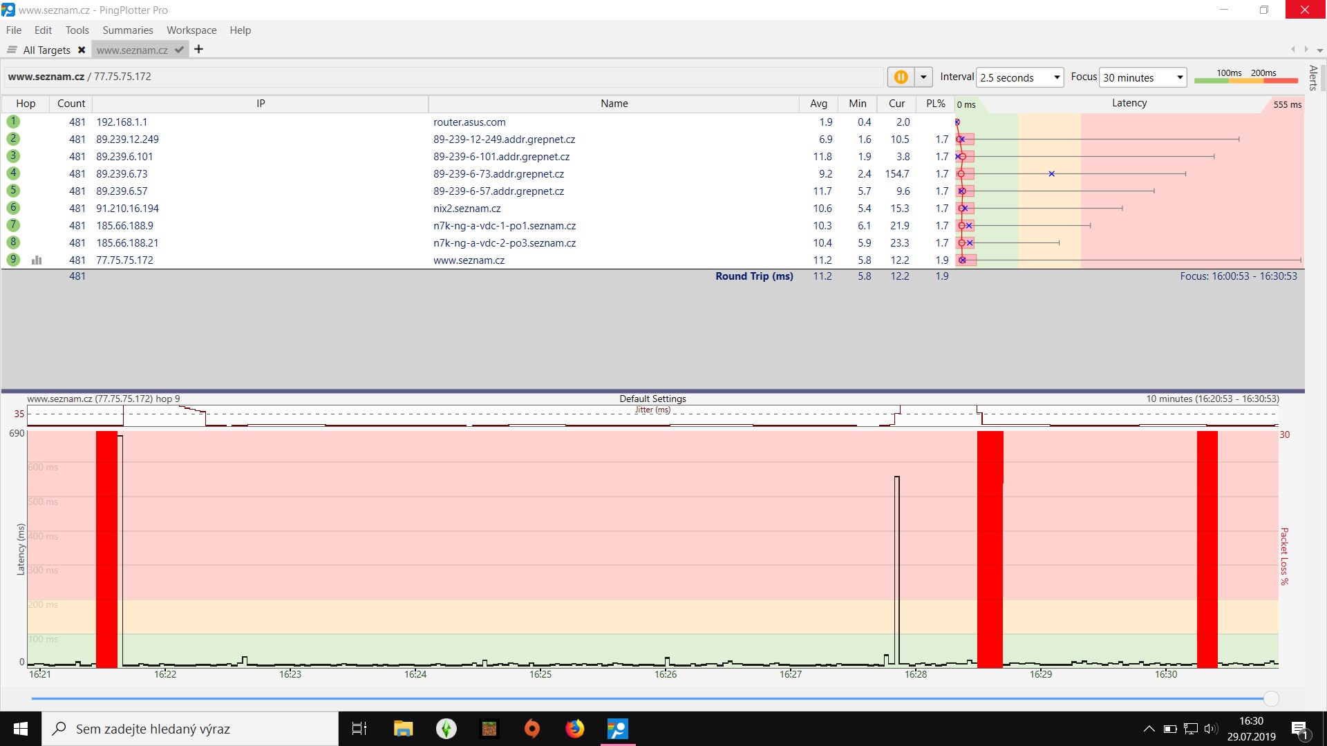 měla bych dotaz, poslední dobou řešíme časté výpadky netu a špatný ping. Při online hrání je to katastrofa. S poskytovatelem už to řeším nějakou dobu, ale pokaždé mi řekne, že on žádný problém nevidí a že prý jestli to nedělá náš router. Našla jsem si program pingplotter a nějakou dobu měřila a chtěla bych vás poprosit o radu, jestli je problém u nás nebo u nich a můžu jim to omlátit přes hlavu