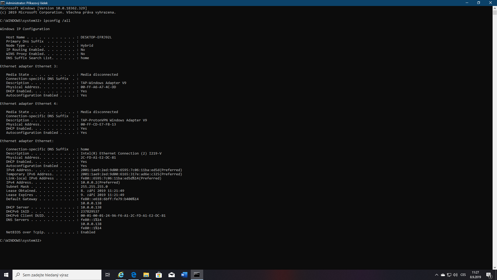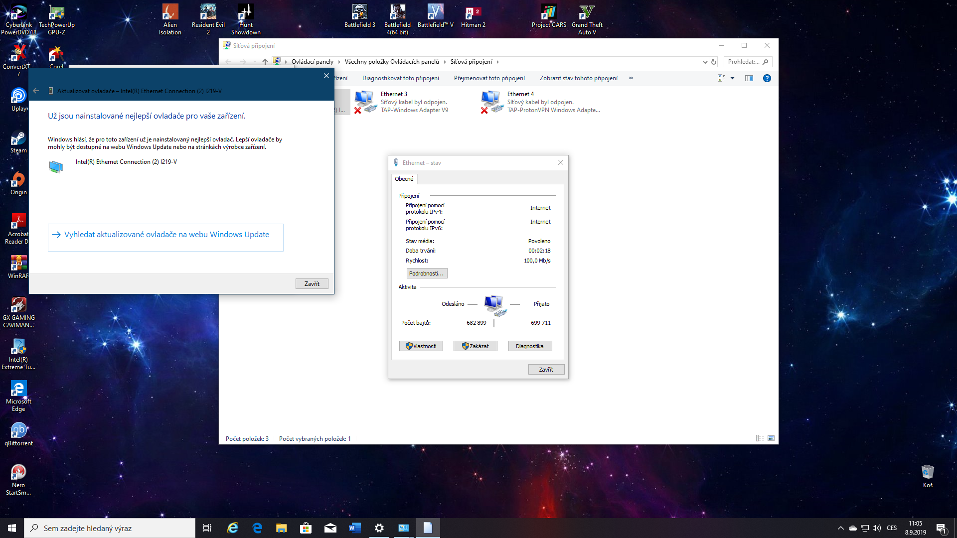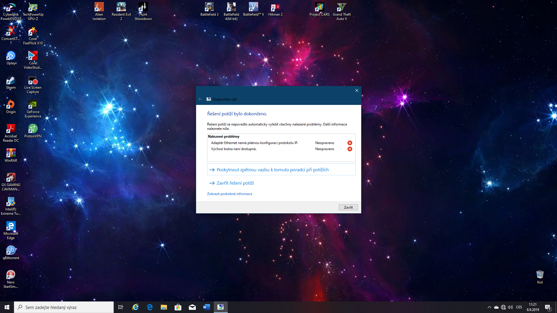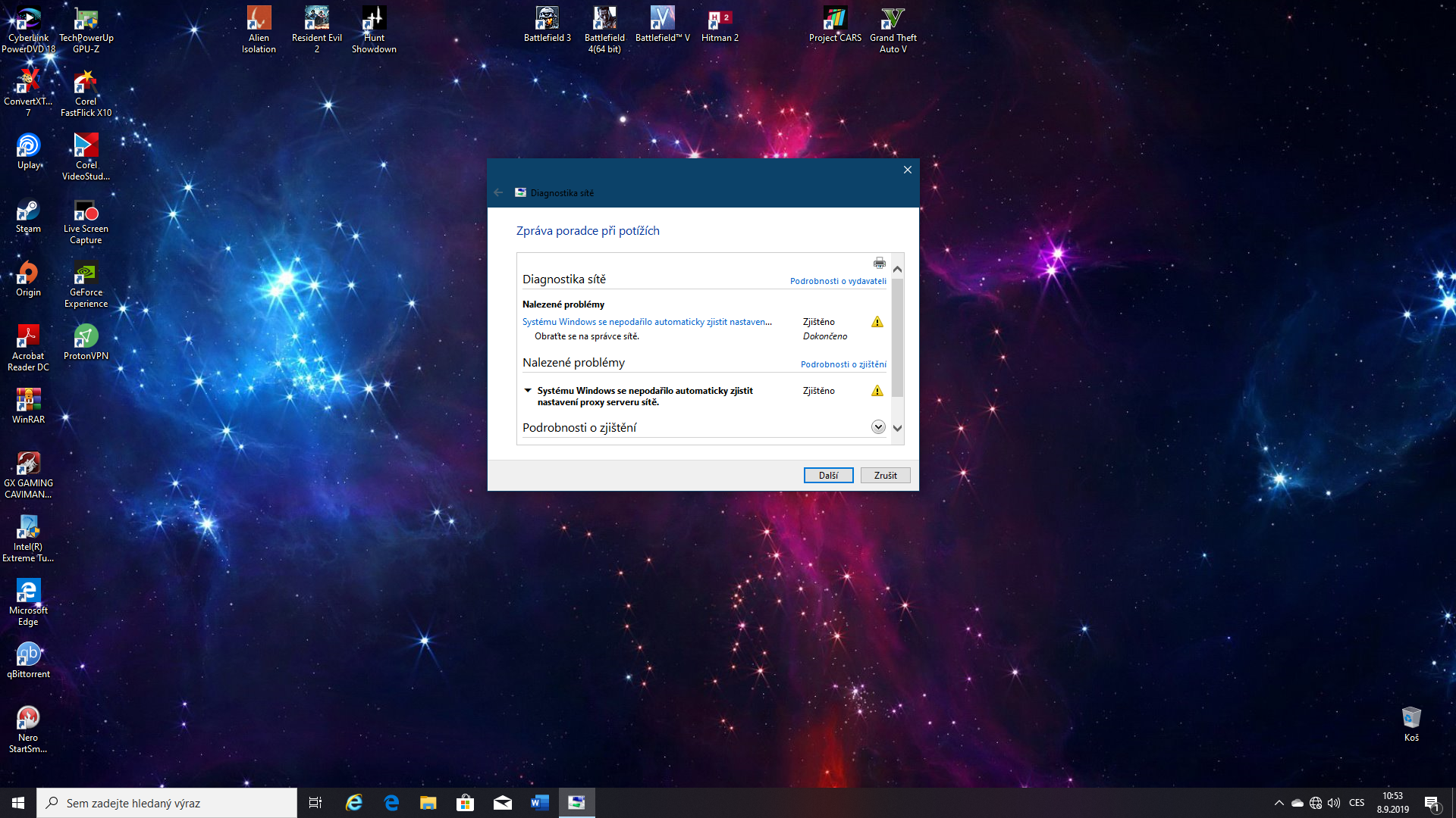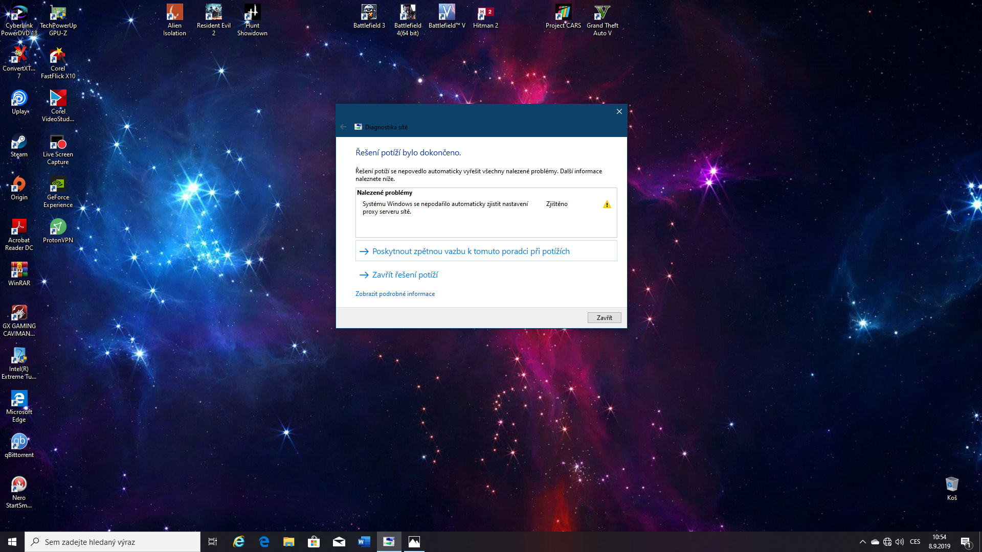 Dobrý den, už jsem tu jednou psal stejný problém, ale internet vždy naskočil, tak jsem to dál neřešil. Teď už vím, v jakém případě přestane internet fungovat. Chybová hláška je vždy stejná, " Adresa proxy serveru sítě nebyla nalezena". Během pár minut, nebo při restartování modemu vše naskočí do normálu, ale jen v případě, že je pc Zapnuté. Jakmile pc zapnu, internet do pár minut funguje, při restartování modemu do pár sekund. Když pc vypnu, internet přestane fungovat a bliká oranžově kontrolka DSL a nemám k internetu přístup. Mám internet Zyxel VDSL a do pc jde kabel DSL a přes modem v nastavení Wireless mám zapnutou Wi-Fi, kterou používám pro mobil nebo notebook, takže když vypnu pc nemám přístup k internetu.Tento problém nastal zřejmě při používání VPN tunelu v programu ProtonVPN, od té doby to zřejmě blbne. V nastavení internetu jsem si nehrál nebo aspoň tuším, že jsem si s tím nehrál, muselo se to nastavit samo nebo někdo z rodiny tam něco nastavil a neví o tom. Jaké screeny mám poslat, aby se ten problém podařilo zjistit? V internetu se moc nevyznám.