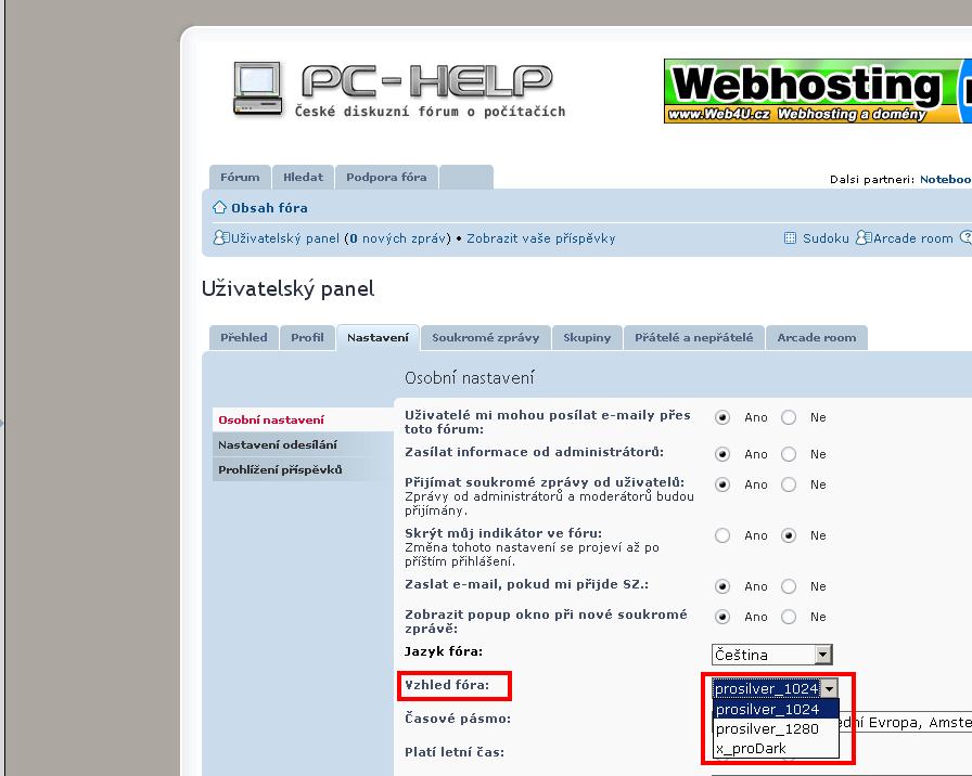 Jak si změnit svůj styl: Uživatelský panel >> Nastavení >> Vzhled fóra (viz. obr)