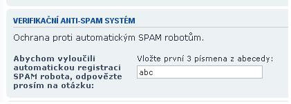 Jako odpověď na tento výskyt SPAMů jsme aktivovali dodatečnou anti-spam ochranu, která je součástí registračního formuláře a která by měla zamezit automatické registraci těchto škodlivých robotů. Jedná se o jednoduchou otázku v českém jazyce (viz. obr. níže). V následujících dnech zároveň dojde k vypnutí ochrany pomocí obrázkového kódu (a tím ke zjednodušení registrace pro nové uživatele). Pokud se to osvědčí, budeme se chránit "pouze" českým anti-spam filtrem.