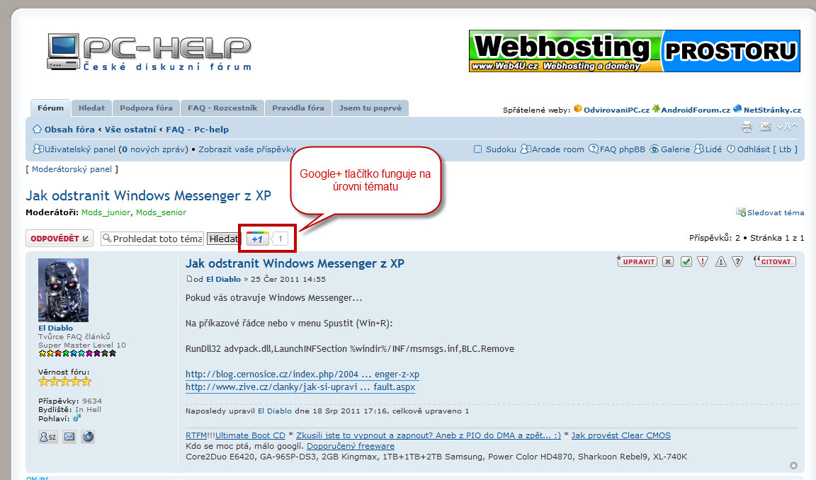 Pomocí tohoto tlačítka je možné napříč celým fórem "dát svůj hlas" tématům, která vám připadají zajímavá (užitečná, vtipná, propracovaná...každý ať si dosadí to své). Google+ tlačítko nechápejte prosím jako další módní výstřelek "trapných" sociálních sítí. G+ bude mít vliv i na Google vyhledávání => do budoucna tak může pomoci i vám k nalezení kvalitního článku, rady, informace...