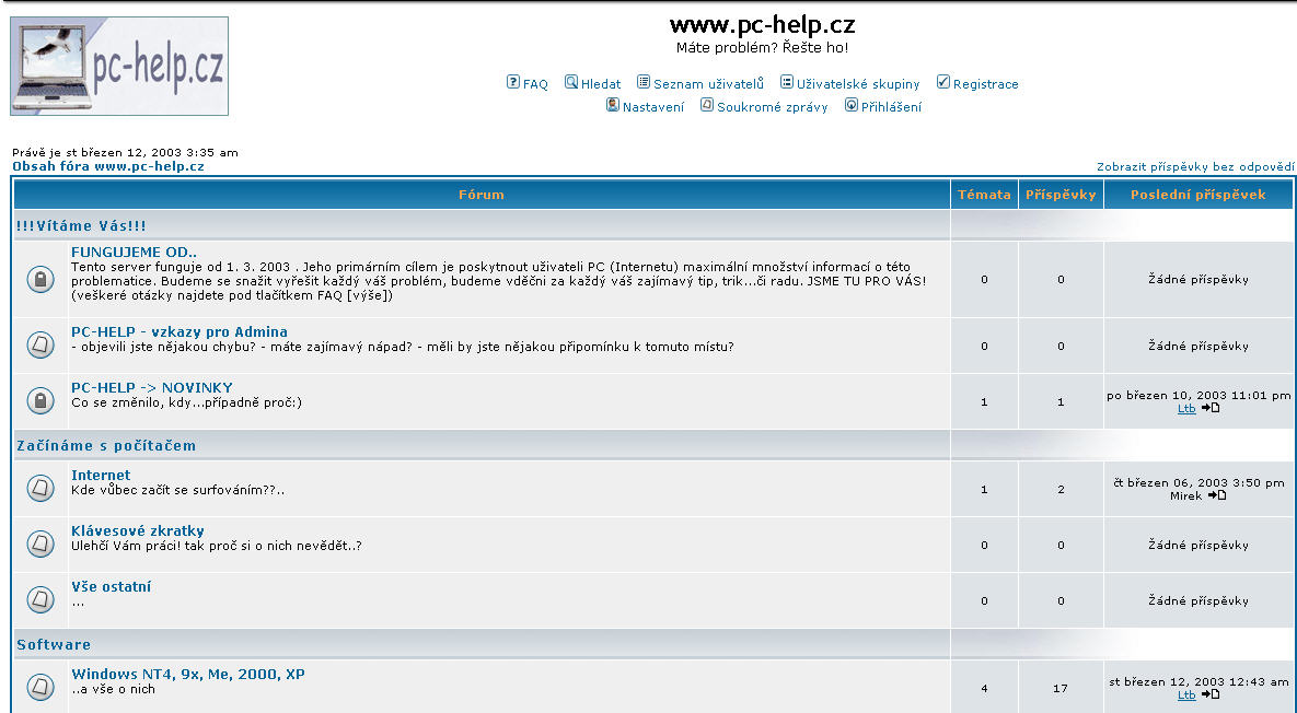 Tak jako řada jiných webů i PC-HELP se postupně vyvíjel - jak názorově, tak i svým vzhledem. Názorově již máme myslím celou řadu let jasno. Ve fóru nestrpíme žádnou formu warezu či nelegálního software. :evil: Přesto však stále zůstáváme místem pro umisťování PC dotazů všeho druhu. S otevřenou náručí vítáme každého, kdo řeší nějaký svůj PC problém. Nicméně se stejně otevřenou náručí vítáme i řadu rádců, kteří svojí nekonečnou snahou pomoci ostatním jsou pro nás nedocenitelnými partnery. Častokrát se lidi udivují, když jim vyprávím, na jakém principu naše fórum pracuje. Jen nevěřícně kroutí hlavou a přemýšlí nad tím, jak je to vůbec možné, že v dnešní době něco takového vůbec existuje. Že se někdo snaží bezzištně pomoci druhým, aniž by z toho, kromě dobrého pocitu a ranků ve fóru, něco dalšího měl..... Ale zpět k tomu vývoji - pojďme se teď projít časem....od roku 2003 až po současnost.
