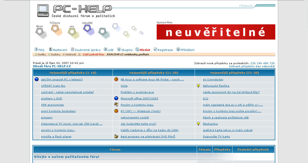 ...rok 2007 byl v ledasčem zlomový. Jednak jsme rozšířili přehledovou tabulku z TOP20 na TOP30 aktuálních témat. Rovněž jsme do našeho loga přidali (dnes již rovněž legendární) ikonu PC. Nicméně co je asi nejdůležitější - získali jsme prvního dlouhodobějšího sponzora fóra. A ještě jedna zajímavá informace navíc - v té době nám dorazila první nabídka na odkoupení celého projektu PC-HELP od jedné nejmenované společnosti 8) Jak to celé dopadlo si asi každý domyslí, samozřejmě jsme fórum neprodali...
