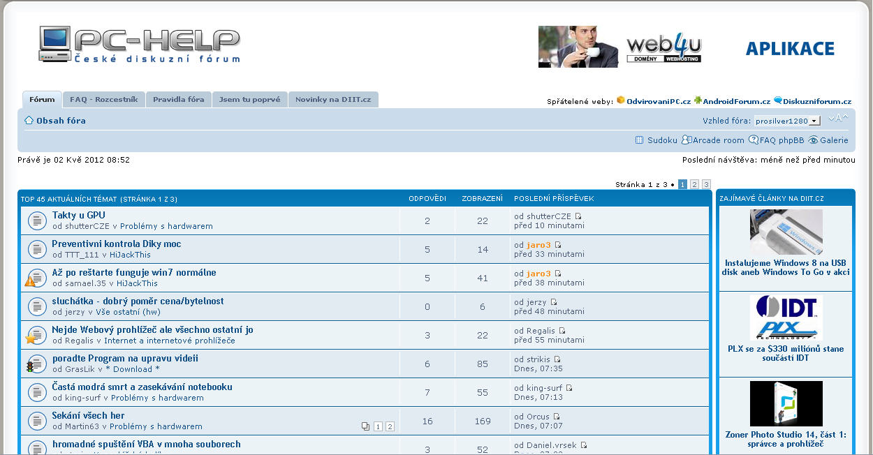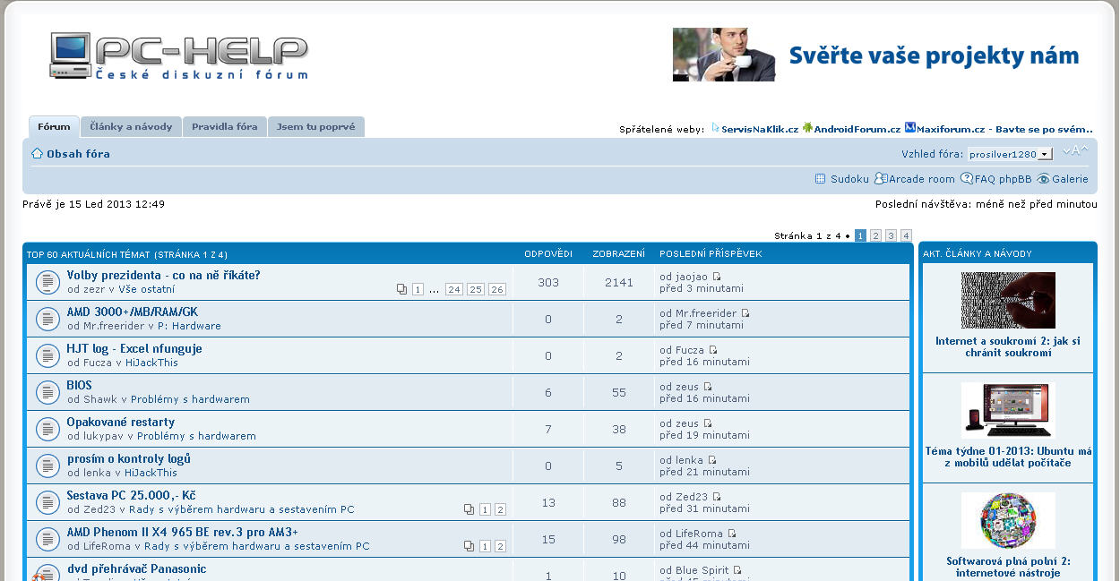 Kdysi jsem hledal informace, kterak zadrátovat a rozchodit domácí desetimegovou síť, složenou na tehdejší dobu z úctyhodných čtyř počítačů. Nějakým zázrakem se mi podařilo nalézt pár dní fungující PC-Help. Tehdy mi poradil sám nejvyšší a jelikož poradil dobře, vracel jsem se častěji, občas i svou radou přispěl do mlýna a snad jsem i já trochu pomohl k tomu, že zde nebereme moc vážně věkové rozdíly a celkově se snažíme udržet přátelskou atmosféru.