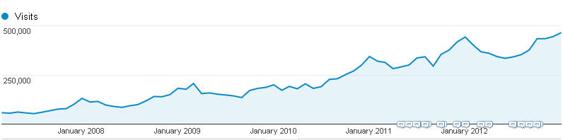 ....a jsme v roce 2013. Pojďme se ještě podívat, jak se fóru za celou tu dobu vedlo co se týče návštěvnosti - resp. pouze za období r2007 - dnes (dříve jsme GoogleAnalytics účet neměli). Jak je vidět, jdeme stále "do kopce" a jsme za to moc rádi 8) Z malých čísel se roste snadno a jelikož se již dávno v malých číslech nepohybujeme, zachování růstu je čím dál tím obtížnější.