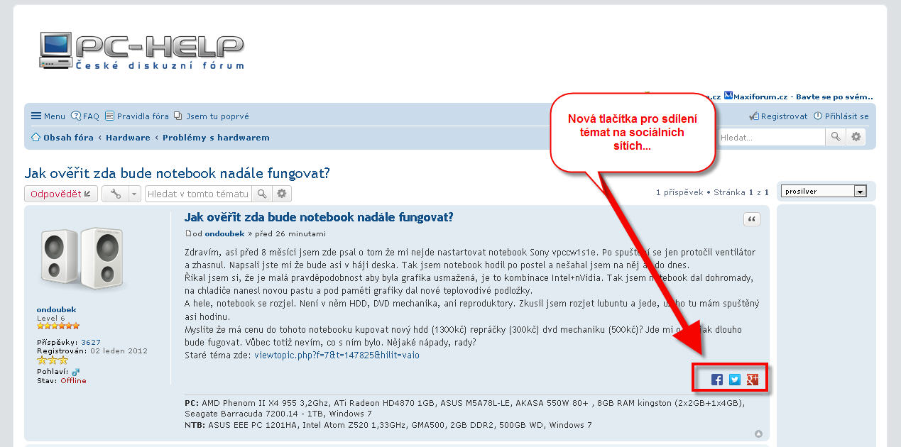 Rád bych zde oznámil novinku v našem fóru, kterou reprezentují 3 ikonky v pravém spodním rohu prvního příspěvku, v každém tématu. Díky těmto ikonkám je možné jakékoliv téma snadným způsobem sdílet na sociálních sítích. Z mnoha dostupných jsem vybral standardní trojici Facebook, Twitter a Google+.